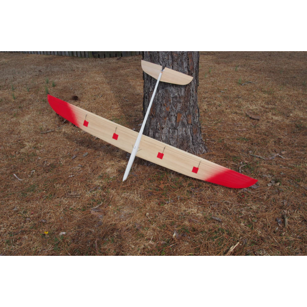 Le bord d'attaque est posé et poncé, les empennages en V sont en balsa léger et poncés avec les gouvernes articulées.